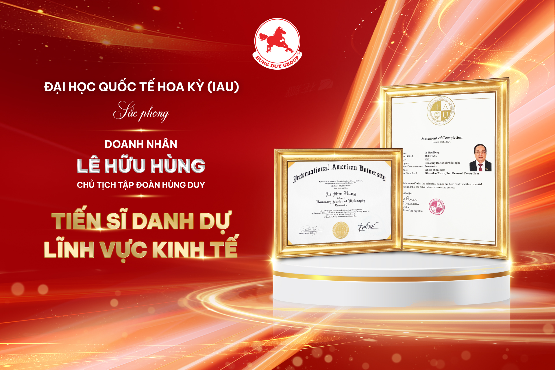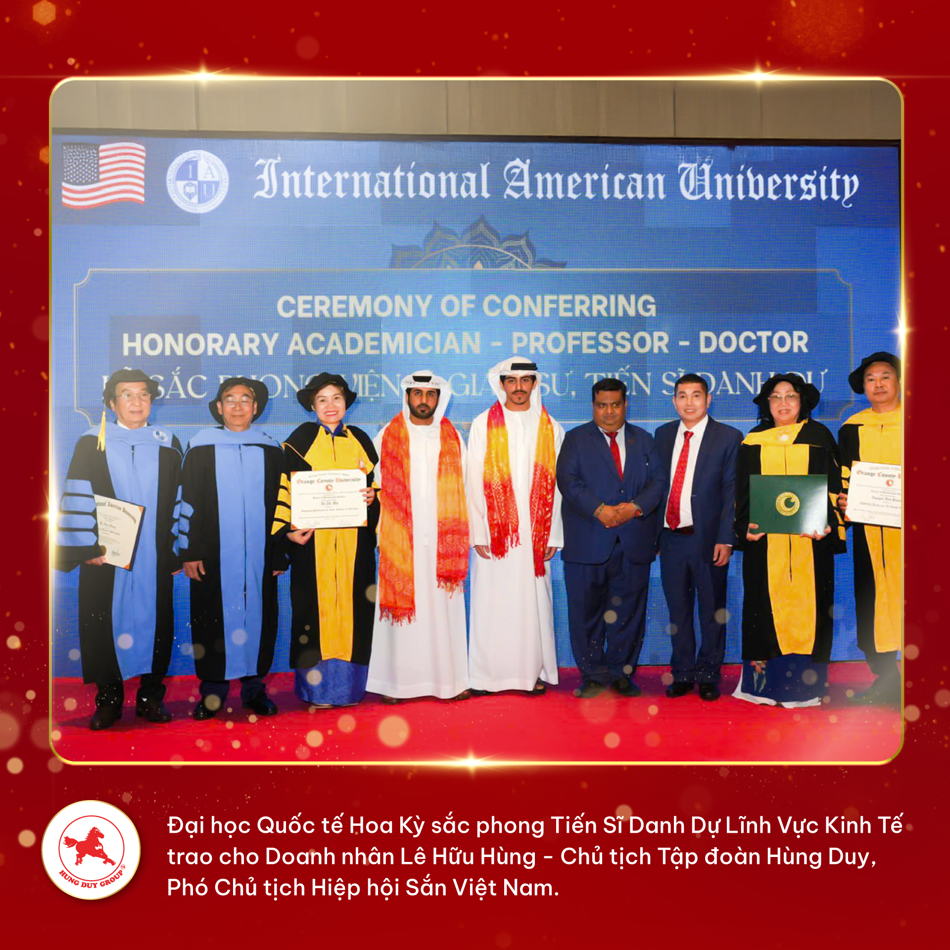Hội đồng giáo sư và Hội đồng khoa học của Trường Đại học Quốc tế Hoa Kỳ (International American University) đã trao bằng công nhận và sắc phong Tiến Sĩ Danh Dự Lĩnh Vực Kinh Tế cho Doanh nhân Lê Hữu Hùng – Chủ tịch Tập đoàn Hùng Duy, Phó Chủ tịch Hiệp Hội Sắn Việt Nam trong khuôn khổ sự kiện “Diễn đàn Khoa học và Kinh tế Toàn cầu năm 2024” tổ chức tại Dubai.